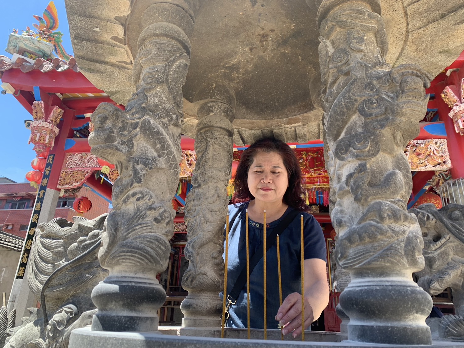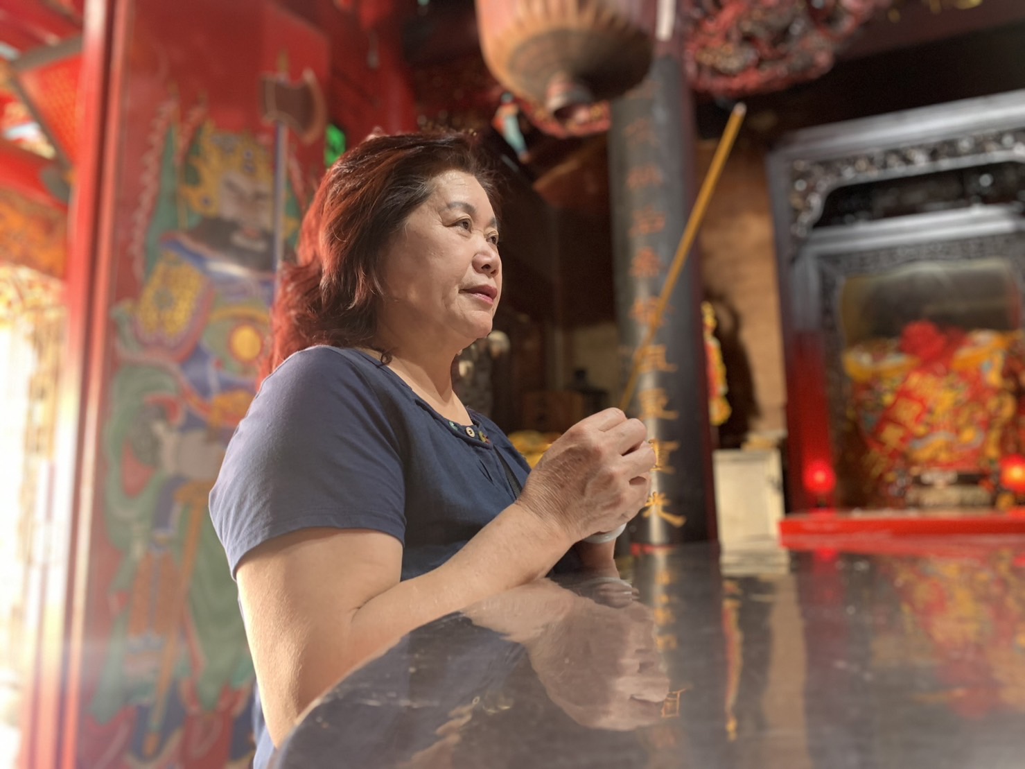 今年初,總是帶著笑容,熱心熱情的林麗英接棒南門媽祖會小組長工作,她拿出手機相簿,跟筆者一一說明金門縣僅剩兩支「涼傘隊」的風光歷史,表示她會繼續維繫這個象徵媽祖文化一環的民俗技藝,即使隨著年紀漸長,許多志工不斷凋零,但她會努力挖掘新血加入,期待將這個特殊的民俗技藝繼續傳承下去。 清理了香爐內的香,林麗英悠悠燃起一支香,對著媽祖口中唸唸有詞,問她跟媽祖都說什麼?她笑著說,「請媽祖保佑家人身體健康、平安!」 她說,這麼多年來,她跟媽祖不求財、不求官,只求保佑家人健康平安,因為她深知,「身體健康才是最大的財富!」而她也感謝媽祖聽到她的祈求,讓她跟在台灣發展的子女都可以健康平安,而她也會在金門當南門媽的「好厝邊」,繼續服務南門媽,讓媽祖繼續作為金門人最堅強的心靈靠山,保佑大家出入平安健康,直到永遠。
